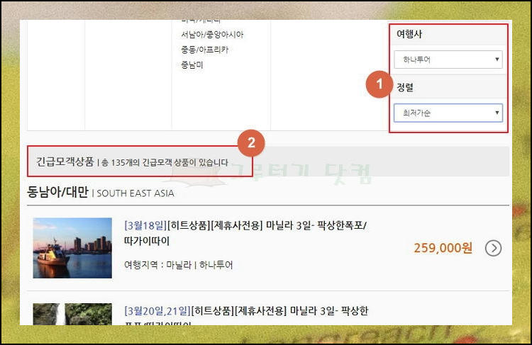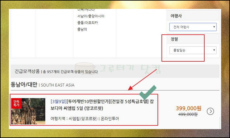 항공권과 투어 패키지는 출발 시간이 임박했을 때 땡처리로 판매되는 경우가 많습니다. 이런 긴급모객 상품은 '최저가순' 정렬을 활용하면 쉽게 탐색할 수 있어요. 출발 일자가 얼마 남지 않았지만 평소보다 훨씬 저렴한 가격으로 제공되는 여행이 나타납니다. 여행사들이 빈자리를 채우기 위해 할인가를 제공하는 것이니 잘 활용해보세요.