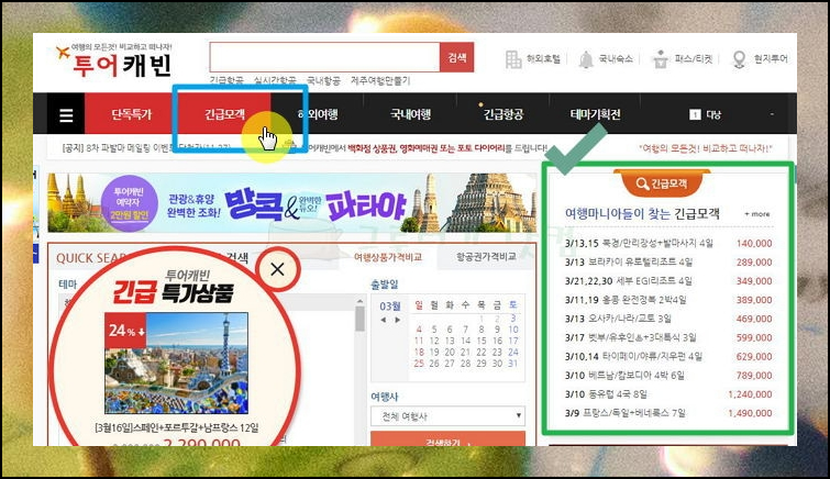 메인 메뉴에서 '긴급모객' 옵션을 클릭해보세요. 화면 우측 상단에는 여행 마니아들이 자주 찾는 특별 패키지들이 모여 있습니다. 이곳에서 다양한 긴급모객 땡처리를 손쉽게 확인할 수 있어요. 진짜 여행 고수들은 이 섹션을 매일 체크하며 특가 상품을 놓치지 않는답니다.