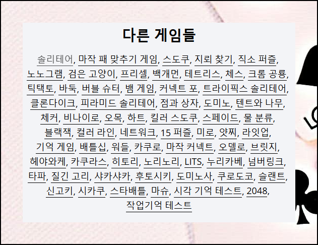 지금까지 여러 가지 카드놀이를 즐길 수 있는 서비스에 대해 알려드렸습니다. 이를 통해 여가 시간을 알차게 보내시길 바래요. 두뇌 활동에도 도움이 될 거에요. 좋은 시간 되세요.
