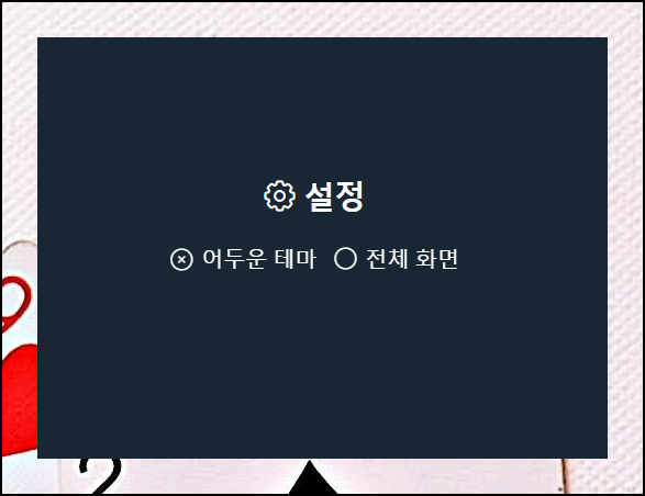 상단의 [설정] 버튼을 통해 카드놀이 환경을 맞춤 설정할 수 있어요. 어두운 테마 적용이나 전체 화면 모드 등 자신에게 맞는 옵션을 선택할 수 있습니다.