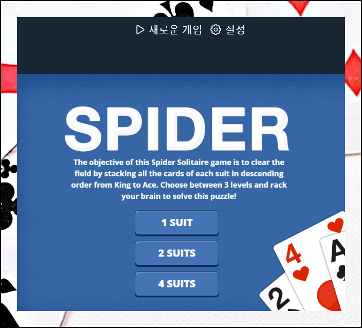 일단 "스파이더 카드놀이 온라인 게임" 사이트에 접속해 주세요. 이번 시간에는 Spider Solitaire 중심으로 카드놀이 게임을 진행하는 방법을 알려드릴건데요. 다음 단계에서 보면 아시겠지만, 다른 종류의 게임도 마음껏 즐길 수 있습니다. 프로그램 설치 과정 없이 바로 시작할 수 있어 편리해요.