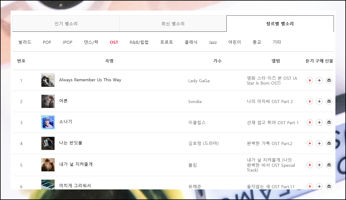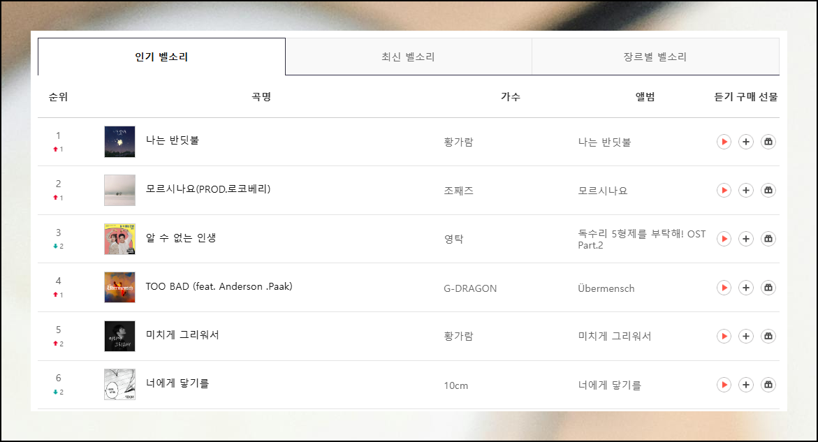 통신사 사이트에서 제공하는 인기 차트 순위를 바로 확인할 수 있어요. 자주 업데이트가 되기 때문에 최신 트랜드를 파악하기가 용이합니다. 인기 음원을 다운로드 방법도 알려드리도록 할게요.