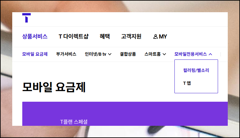 티월드에서는 로그인 없이도 인기 벨소리 순위를 확인할 수 있어요. [상품 서비스] 메뉴를 선택한 다음 [모바일 전용 서비스]를 클릭하면 음원 관련 카테고리로 쉽게 이동할 수 있습니다.
