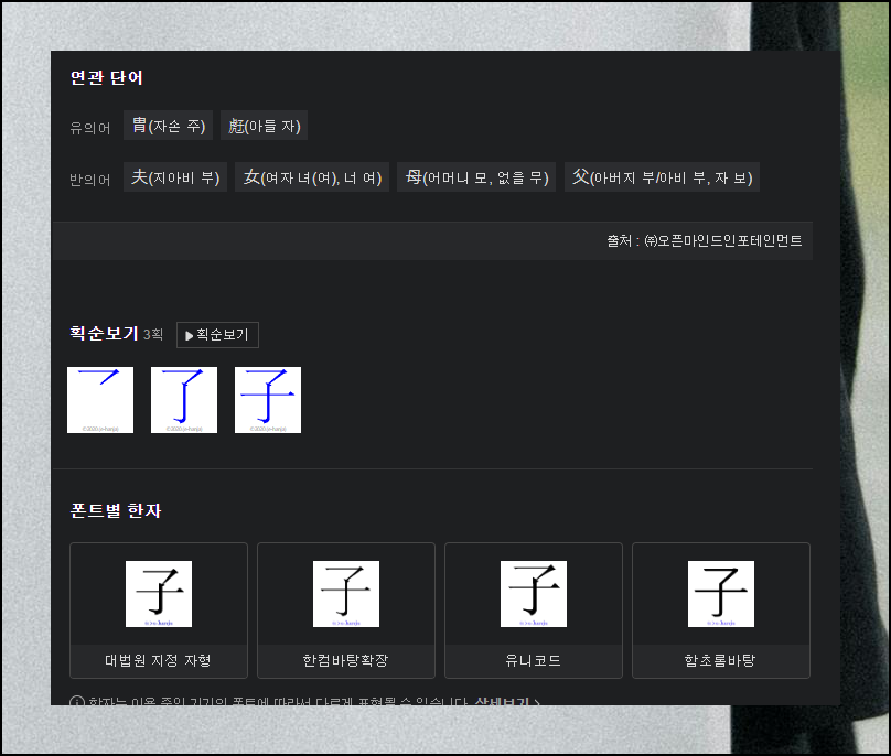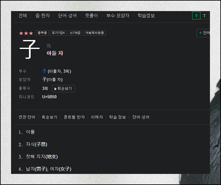 검색한 문자의 영문 뜻도 확인할 수 있고, 포함된 모든 단어와 고사성어도 찾아볼 수 있어요. "子"자만 해도 관련 표현이 4천개를 넘어요. 이렇게 방대한 콘텐츠를 제공하고 있습니다.
