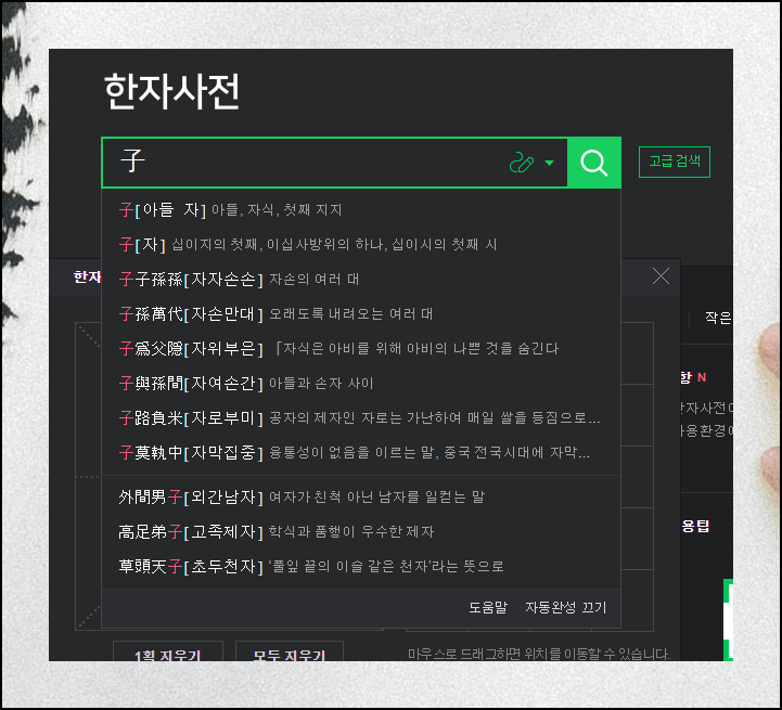 문자가 검색창에 입력이 되면 관련된 결과가 자동으로 표시됩니다. 이 중에서 더 자세히 알고 싶은 글자, 단어, 고사성어를 선택하면 상세 내용을 확인할 수 있어요. 검색 결과가 체계적으로 정리되어 있어 원하는 정보를 쉽게 확인할 수 있습니다.