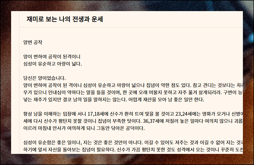 역술 사이트를 통해 이용할 수 있는 해당 서비스는 생년월일과 태어난 시간만 입력하면 바로 결과를 확인할 수 있어 누구나 쉽게 이용할 수 있어요. 더불어 현재의 운세와 타고난 복까지 함께 확인할 수 있어 자신의 과거와 현재, 그리고 미래까지 연결하는 흥미로운 경험을 제공합니다.