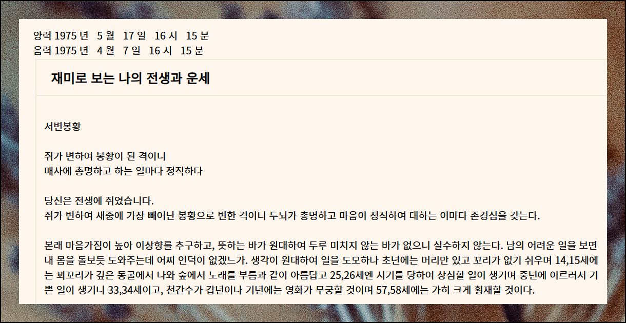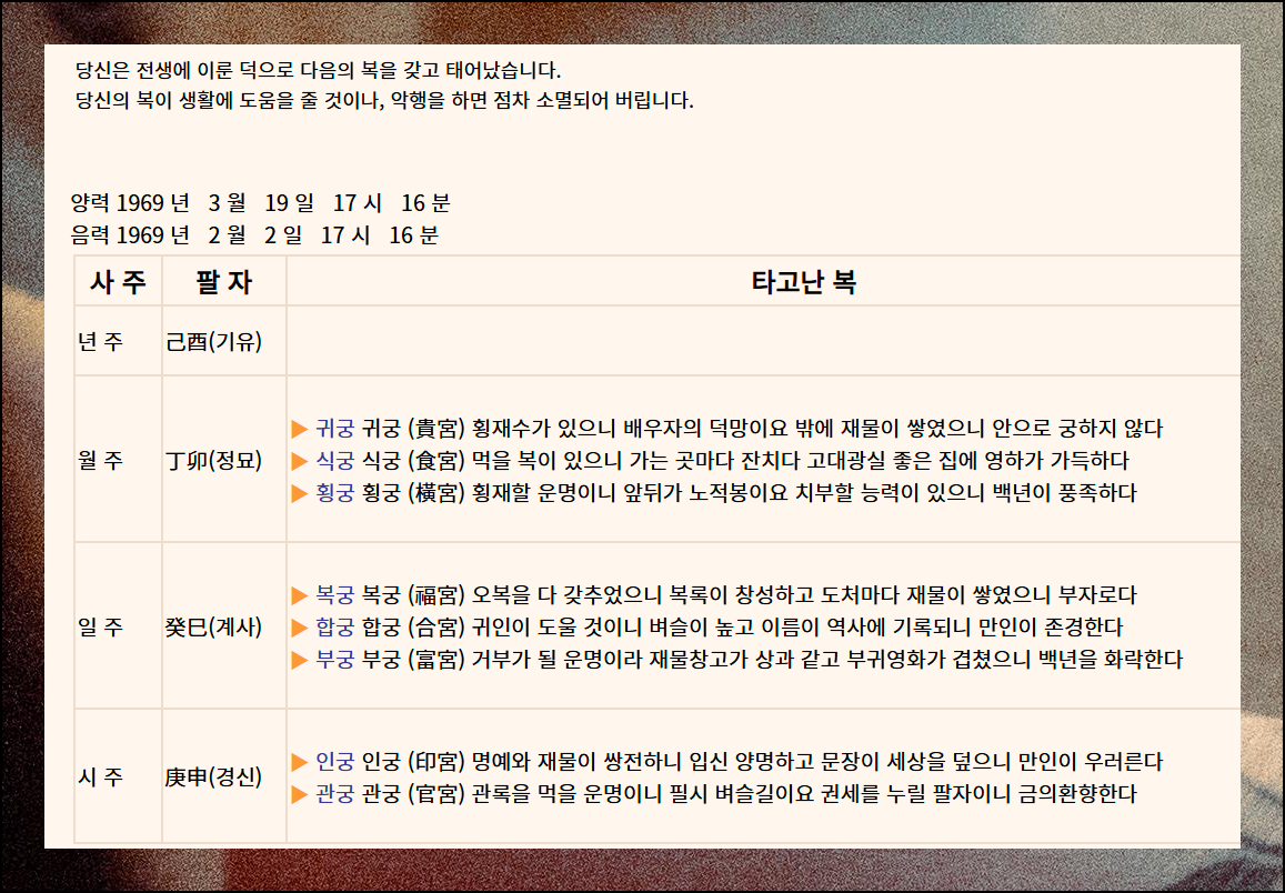 화면에는 년주, 월주, 일주, 시주로 구분된 사주팔자 해석이 표시됩니다. 나의 전생과 현재를 잇는 건강, 재물, 출세와 관련된 운세를 깊이 이해할 수 있어요.