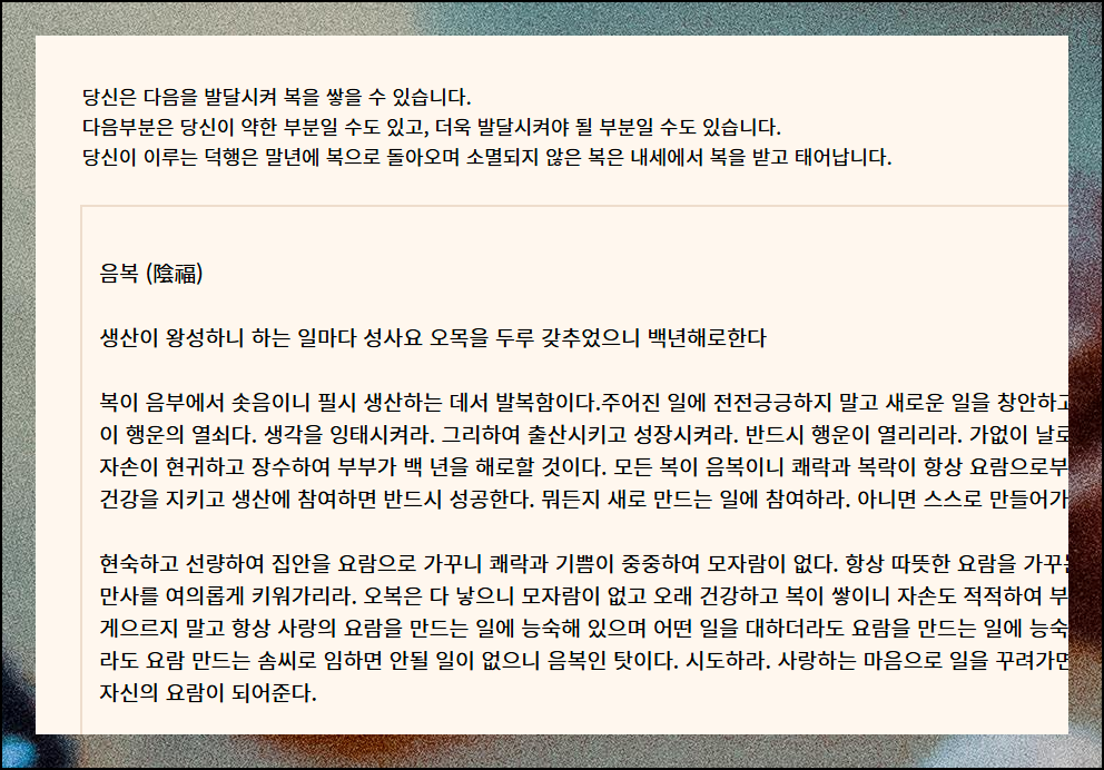 '나의 복' 서비스 마지막 부분에서는 주의사항, 어려움 극복 방안, 그리고 이후 얻게 될 긍정적 성과를 제시합니다. 개인별로 다른 해석이 제공되니 나의 운세를 직접 살펴보세요.