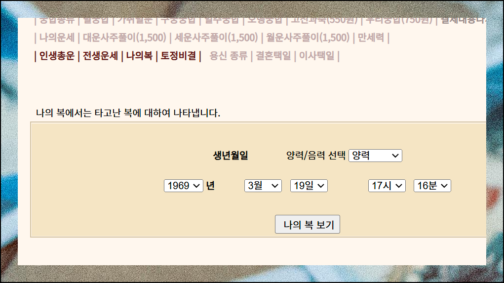 현재에 관련된 역술인 '나의 복' 서비스도 활용해보세요. 현재 당신에게 주어진 운명과 행운에 대한 상세한 풀이를 받아볼 수 있답니다.