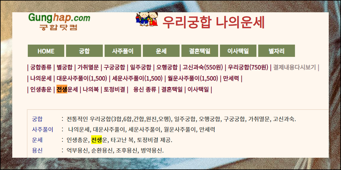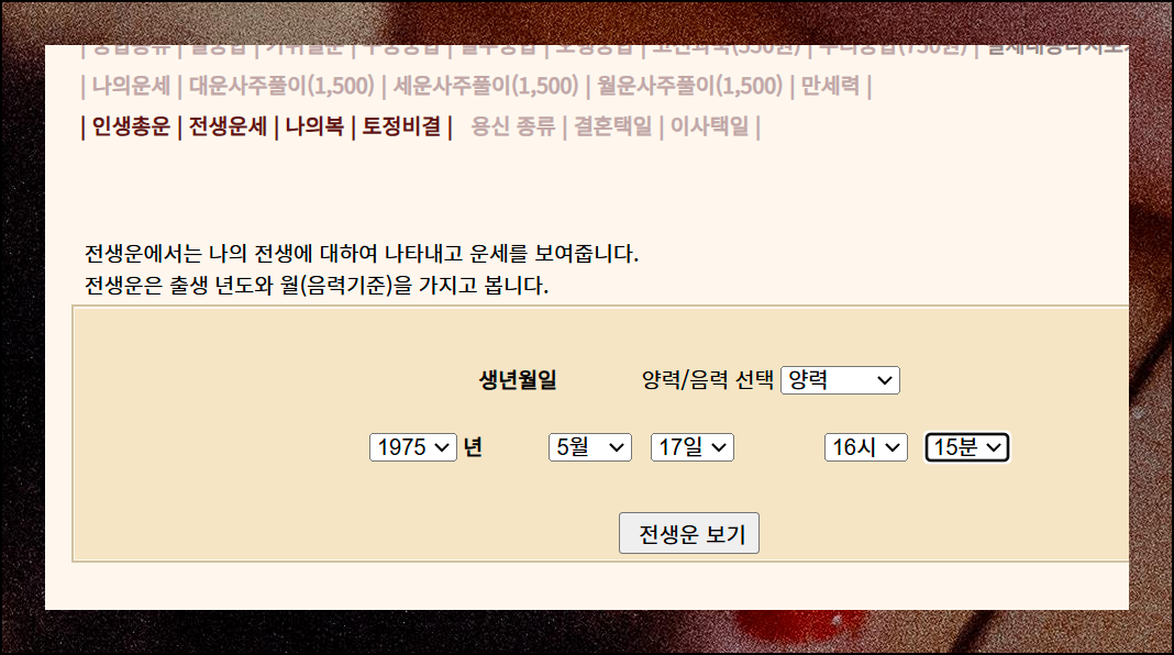 궁합닷컴에는 인생총운, 나의 복, 토정비결, 결혼택일, 이사택일 등 여러 무료 운세 옵션이 마련되어 있어요. 오늘은 특별히 '전생 운세' 항목을 선택해서 이전 생의 모습이 어떠한지 알아보도록 하겠습니다.