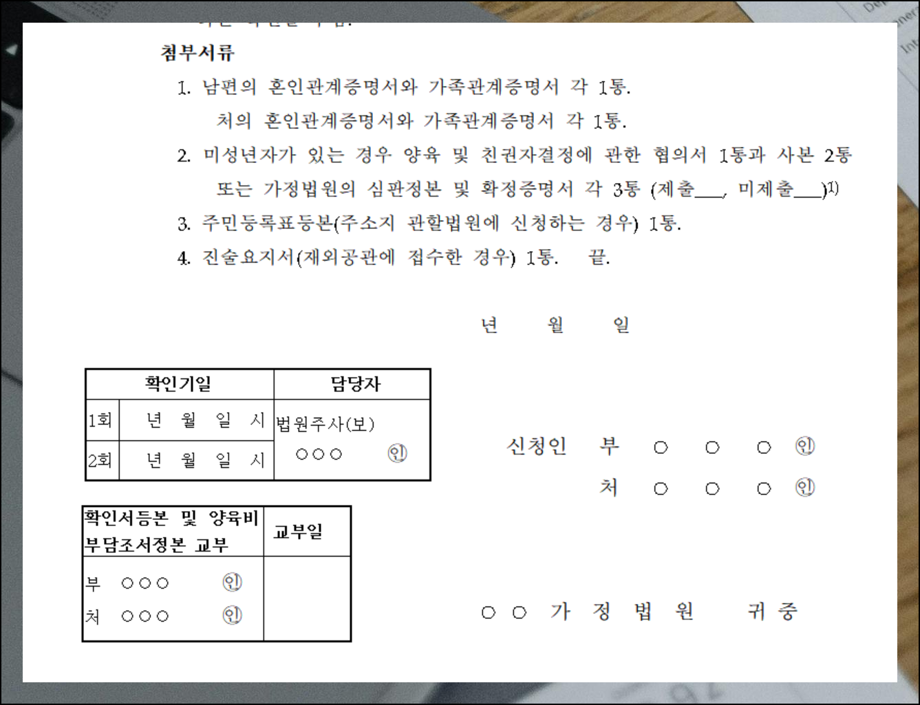 협의이혼 의사확인 신청서는 가장 많이 사용되는 문서인데요, 각 항목의 빈칸만 채우면 되어 생각보다 간단합니다. 양식에는 첨부해야 할 증명서, 협의서, 등본 등의 목록도 함께 표시되어 있으니 미리 준비하세요. 모든 이혼 관련 문서는 정확히 작성해야 합니다.