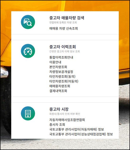 중고차 매매 페이지에서 '중고차 이력조회' 섹션을 확인해보세요. 본인 소유는 물론이고 타인 소유의 차량에 대한 내용을 검색할 수 있는 메뉴가 있습니다.