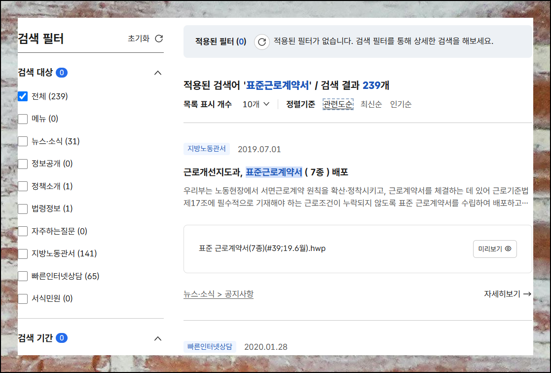 고용노동부 홈페이지에 들어가면 상단 중앙의 검색창에 '표준 근로계약서'만 입력하세요. 검색 결과에서 뉴스와 소식란을 살펴보면 무료 서식 7종이 한눈에 보입니다.