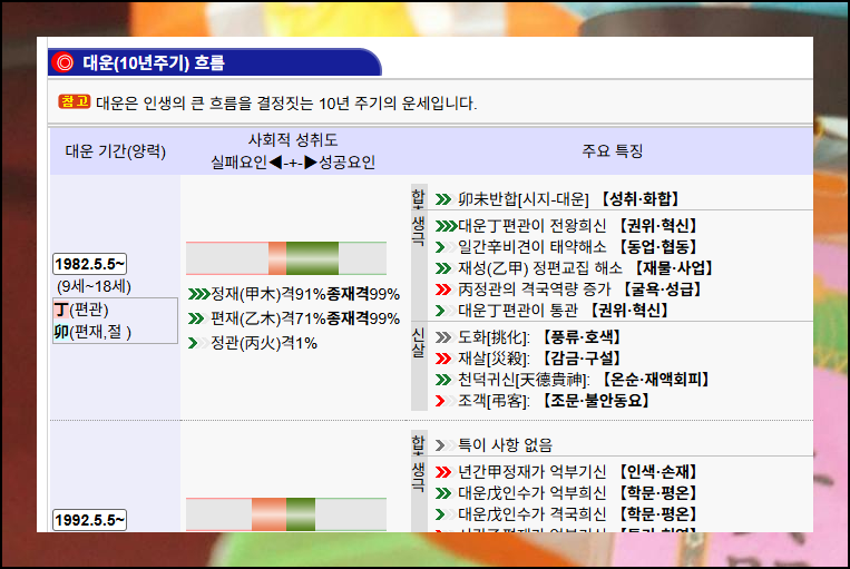 만세력에서 가장 중요하게 다루는 대운에 관한 내용도 이 플랫폼에서 자세히 볼 수 있어요. 무료 서비스임에도 상세한 정보를 제공하는 점이 특징입니다.