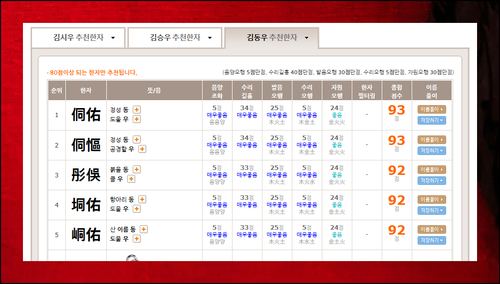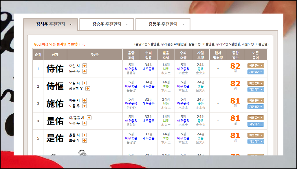 성명학적 기준으로 80점 이상의 우수한 한자들이 추천되었습니다. 의미와 발음이 어우러진 것들 중에서 선택해 만족스러운 결과를 얻을 수 있어요. 작명에 관련된 내용도 설명되어 있어 참고하기 좋습니다.