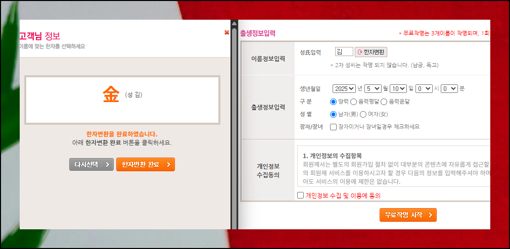이름에 쓰는 한자를 추천 받기 위해서는 성씨, 성별, 생년월일 정보만 기입하면 됩니다. 상당히 간단하지만, 무료 서비스는 사용 횟수가 제한되어 있으니 중요한 부분은 메모하며 진행하세요.