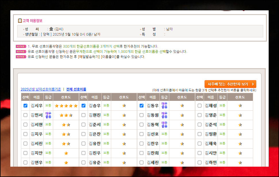 무료 작명 시스템을 통해 300개의 추천 이름을 받아볼 수 있습니다. 마음에 드는 3개를 선택한 후 사주 분석 버튼을 누르면 각각 5개씩 여기에 쓰는 한자를 받아볼 수 있어요. 등급과 개인 선호도를 고려해 가장 적합한 것을 골라보세요.