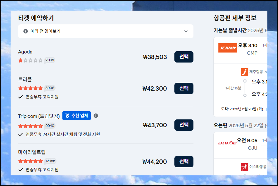 검색 결과 페이지에서는 다양한 가격대의 비행기표가 표시됩니다. 운이 좋다면 왕복 2만원 이하의 특가 티켓도 찾을 수 있어요. 마음에 드는 항공권을 발견했다면 "선택하기" 버튼을 클릭해 예약 과정을 시작하세요.