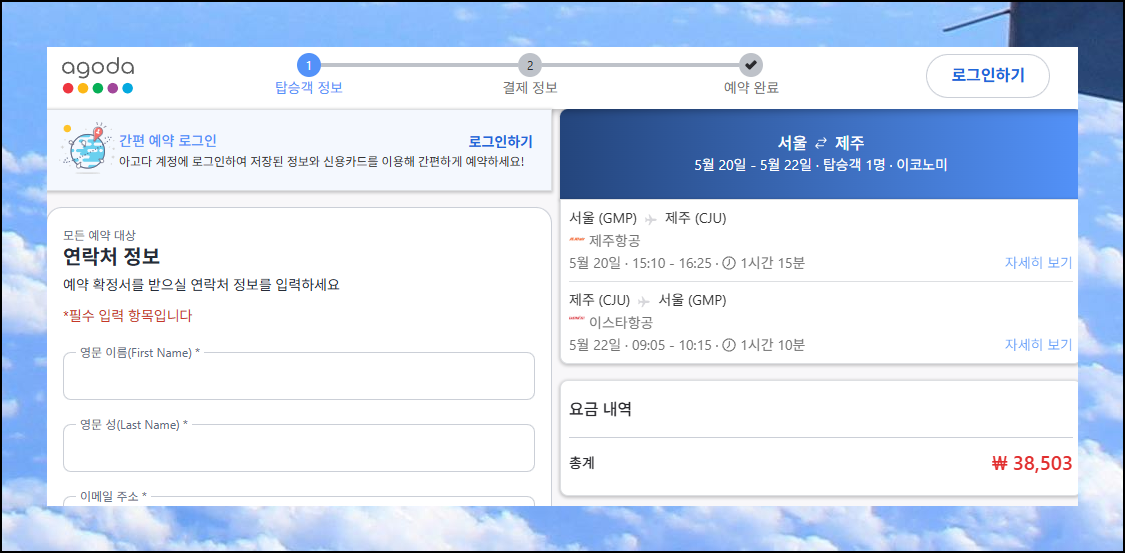 선택한 업체의 예약 페이지로 이동하면 비행 정보를 자세히 확인할 수 있습니다. 출발시간, 도착시간은 물론 수하물 포함 여부와 취소/변경 규정까지 세심히 살펴보세요. 모든 내용을 확인한 후에 개인정보를 입력하고 결제를 완료하면 항공권 구입이 마무리됩니다.