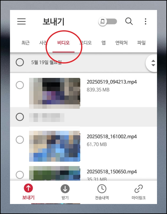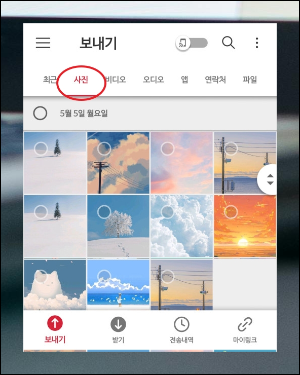 앱 실행 후 화면 왼쪽 아래에서 보내기 메뉴를 찾을 수 있습니다. 사진, 동영상, 연락처, 문서별로 구분되어 있어 원하는 항목만 선택할 수 있어요. 휴대폰에서 필요한 데이터만 골라서 전송할 수 있습니다.
