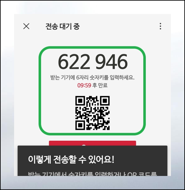 콘텐츠 선택 후 보내기 버튼을 누르면 6자리 숫자와 QR코드가 나타납니다. 휴대폰 데이터 옮기기가 정말 간단해요. 이 코드만 있으면 컴퓨터나 다른 기기에서도 쉽게 자료를 받을 수 있습니다. 직관적인 화면 구성으로 누구나 쉽게 활용할 수 있어요.