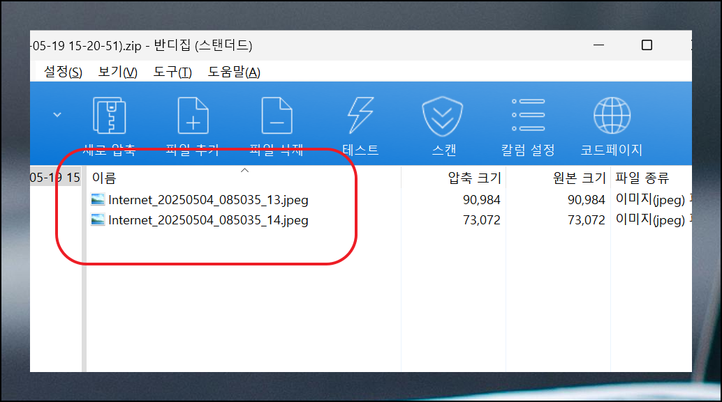 여러 개의 파일을 한 번에 보내면 압축이 된 상태로 전송이 되는데요. 이렇게 옮기기 완료된 파일은 압축을 풀어줘야 합니다. 알집이나 반디집 같은 무료 프로그램을 사용하면 압축 해제를 쉽게 진행할 수 있어요.