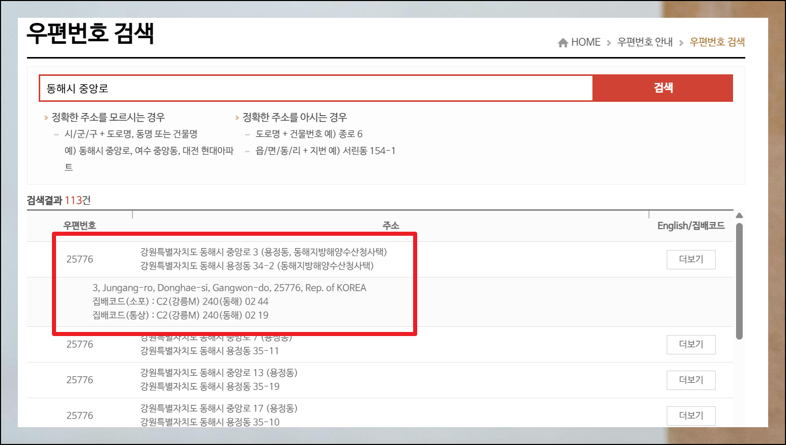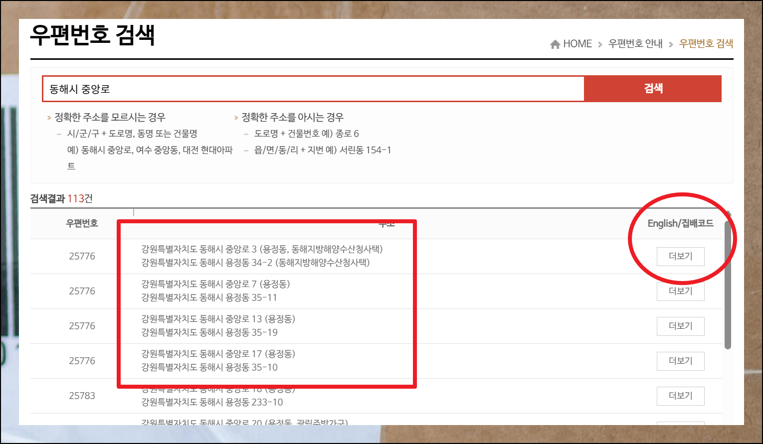 검색 후에는 우편번호와 한글 정보가 먼저 나타납니다. 영문 결과를 즉시 볼 수는 없지만, 'English / 집배코드' 부분 아래에 있는 [더보기] 버튼을 터치하면 됩니다. 이 옵션을 선택하면 집배코드와 함께 영어로 전환된 주소를 확인할 수 있어요.