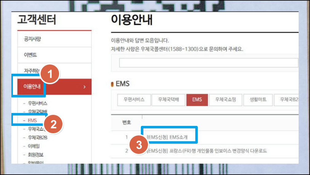 고객센터에 접속하면 여러 선택지가 나타나요. 이용안내 서비스를 누르고 나면 우편서비스와 택배 등 다양한 카테고리가 보입니다. 여기서 EMS를 선택하고 소개 페이지로 이동해주세요.