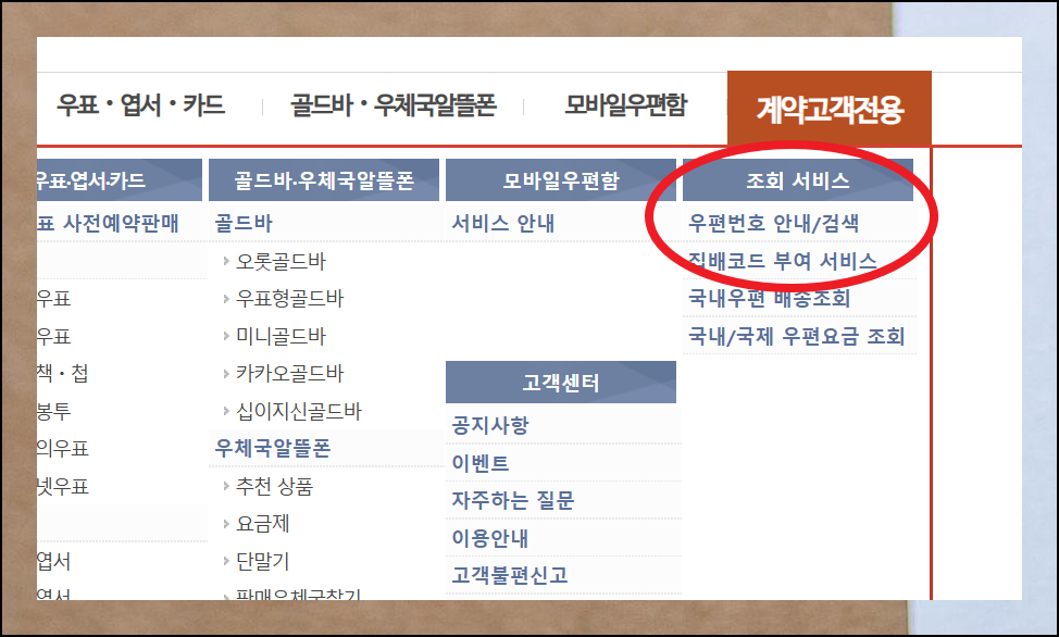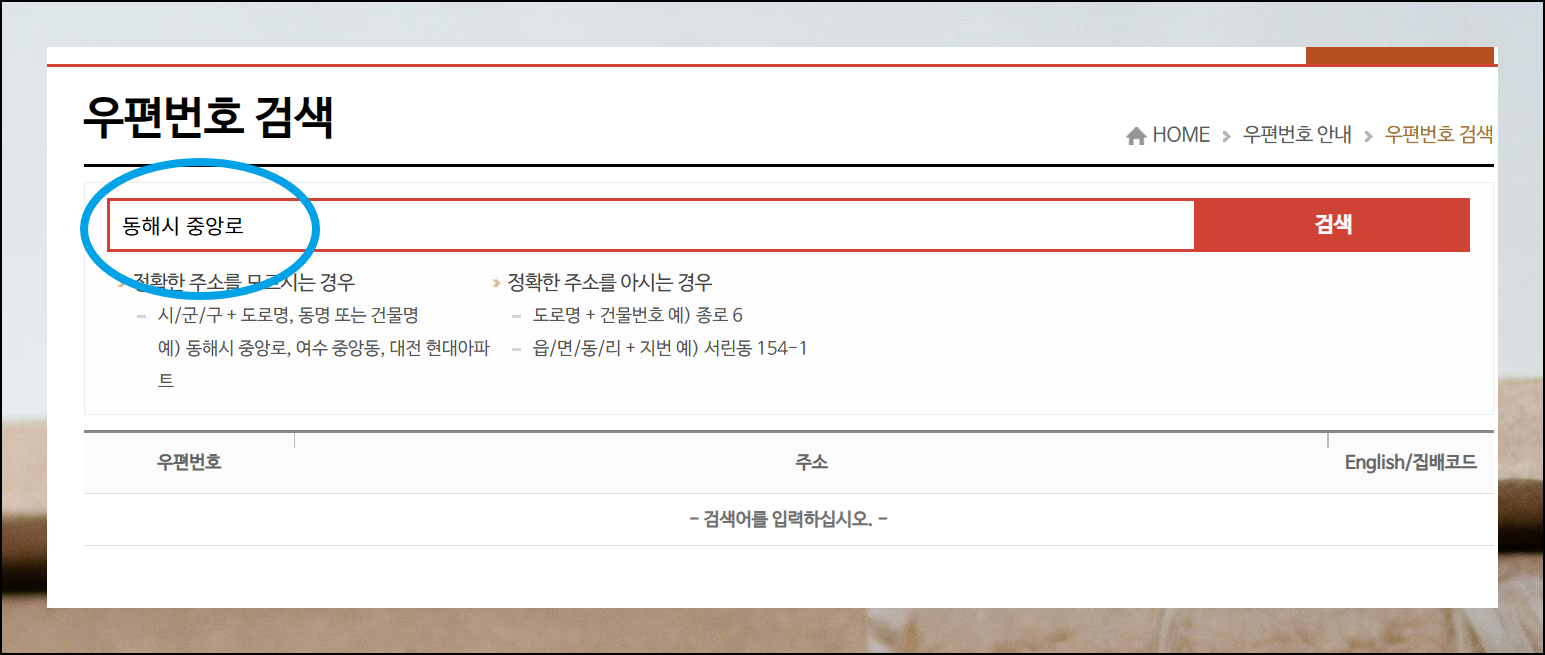 해당 번역기 사용을 위해서는 홈페이지에서 전체 메뉴 보기를 켠 후, [조회 서비스] 카테고리에 있는 [우편번호 안내/검색] 버튼을 눌러도 됩니다.