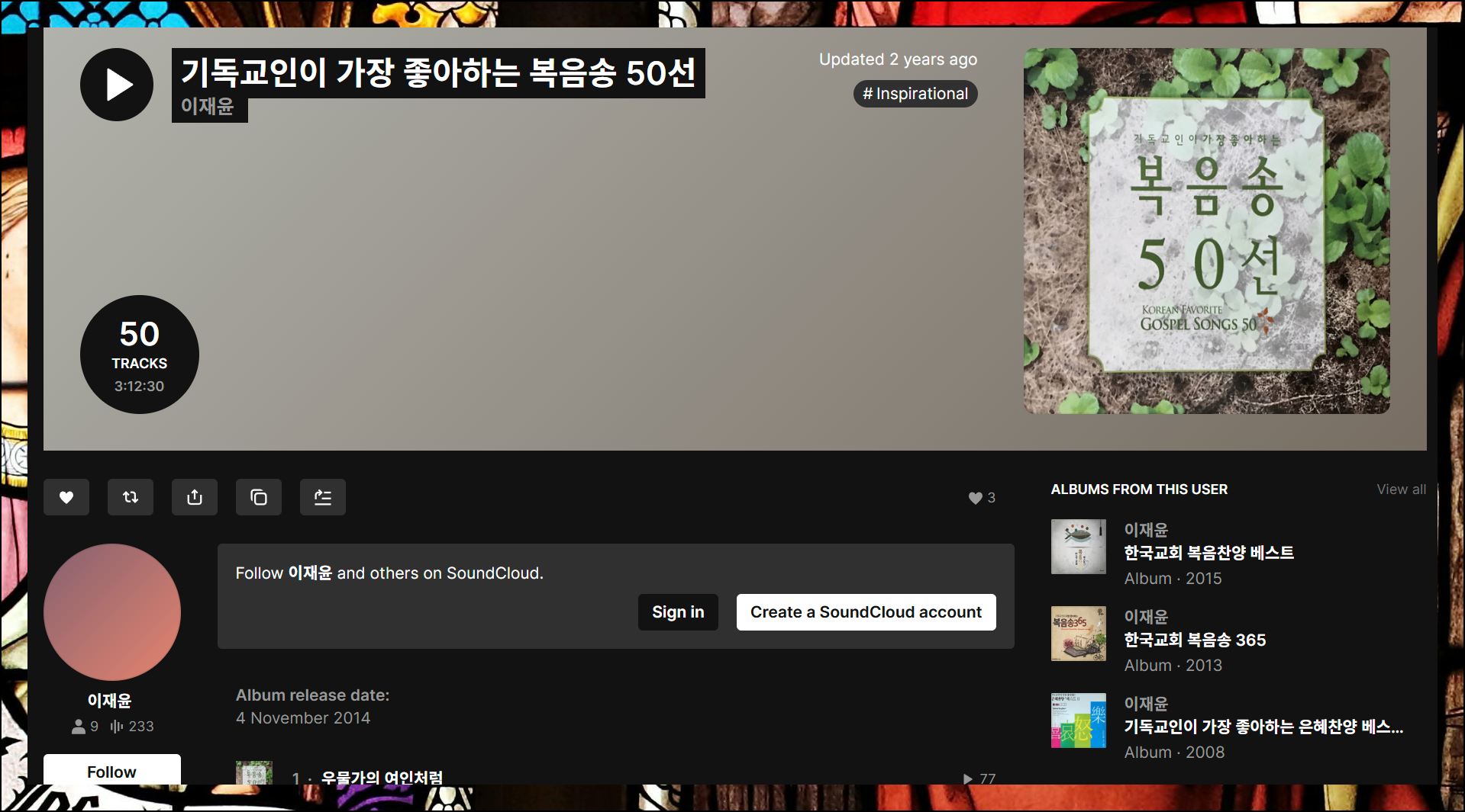 여러 개의 개별 트랙과 재생목록을 나타났습니다. 특히 "기독교인이 가장 좋아하는 복음성가 50선" 모음집이 인상적입니다. 이 밖의 트랙을 모두 세어보면 100곡을 가뿐히 넘을 것 같네요.