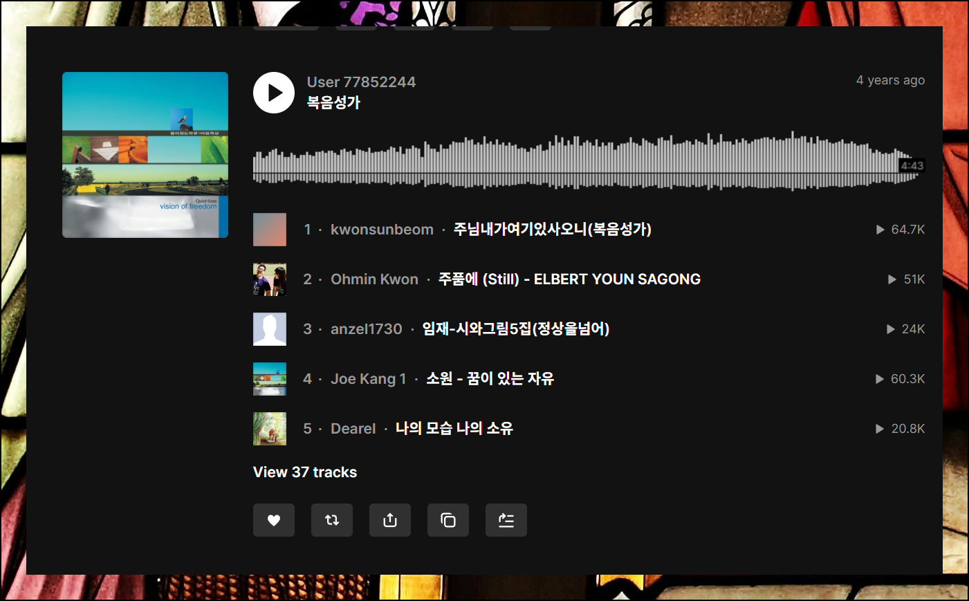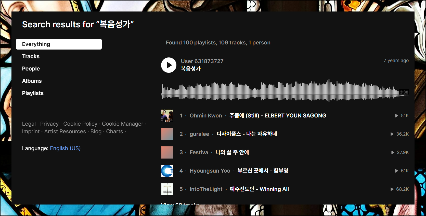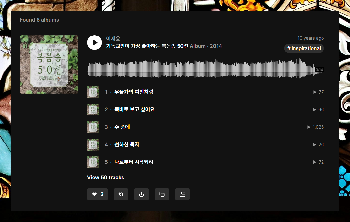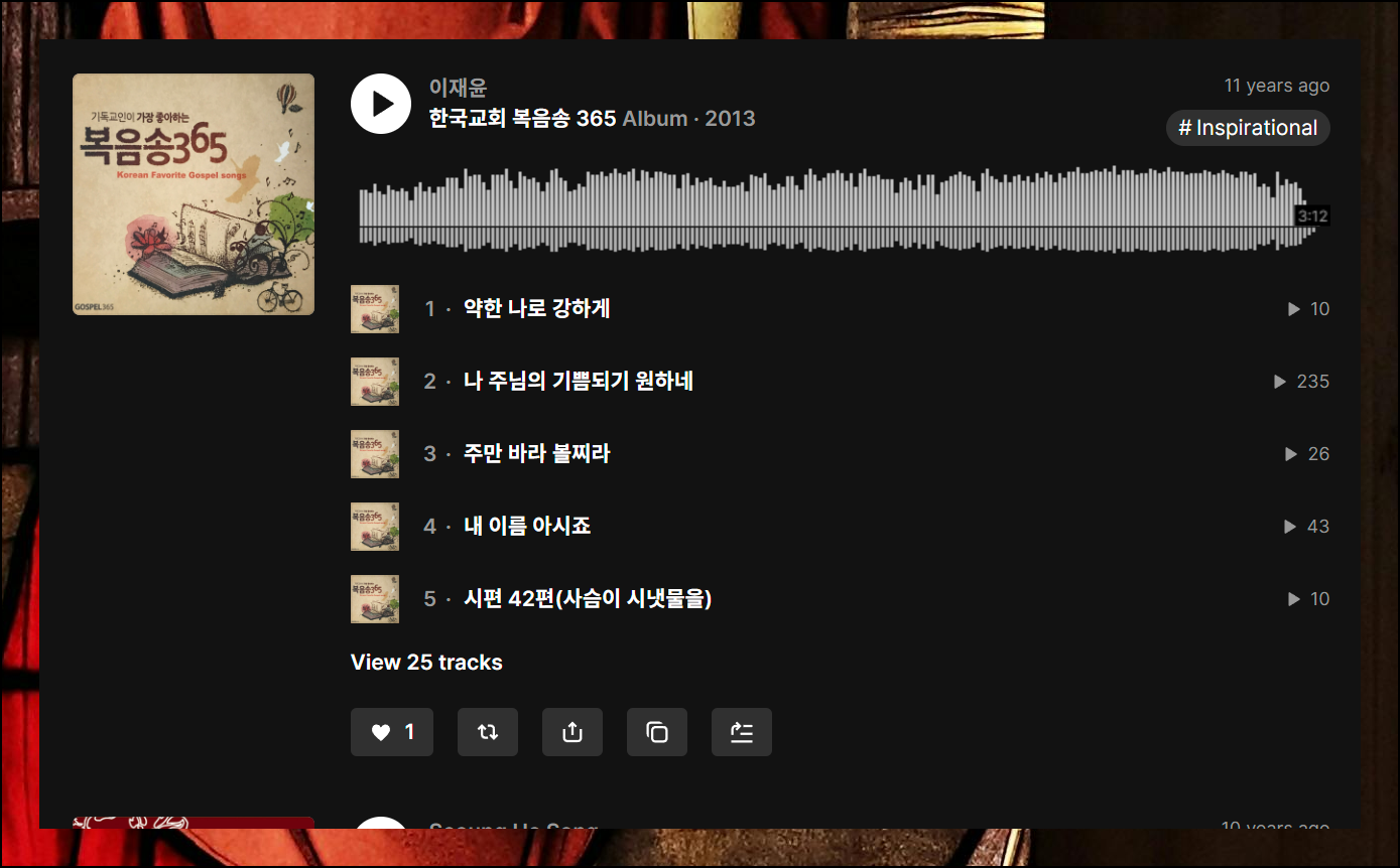 여러 개의 개별 트랙과 재생목록을 나타났습니다. 특히 "기독교인이 가장 좋아하는 복음성가 50선" 모음집이 인상적입니다. 이 밖의 트랙을 모두 세어보면 100곡을 가뿐히 넘을 것 같네요.