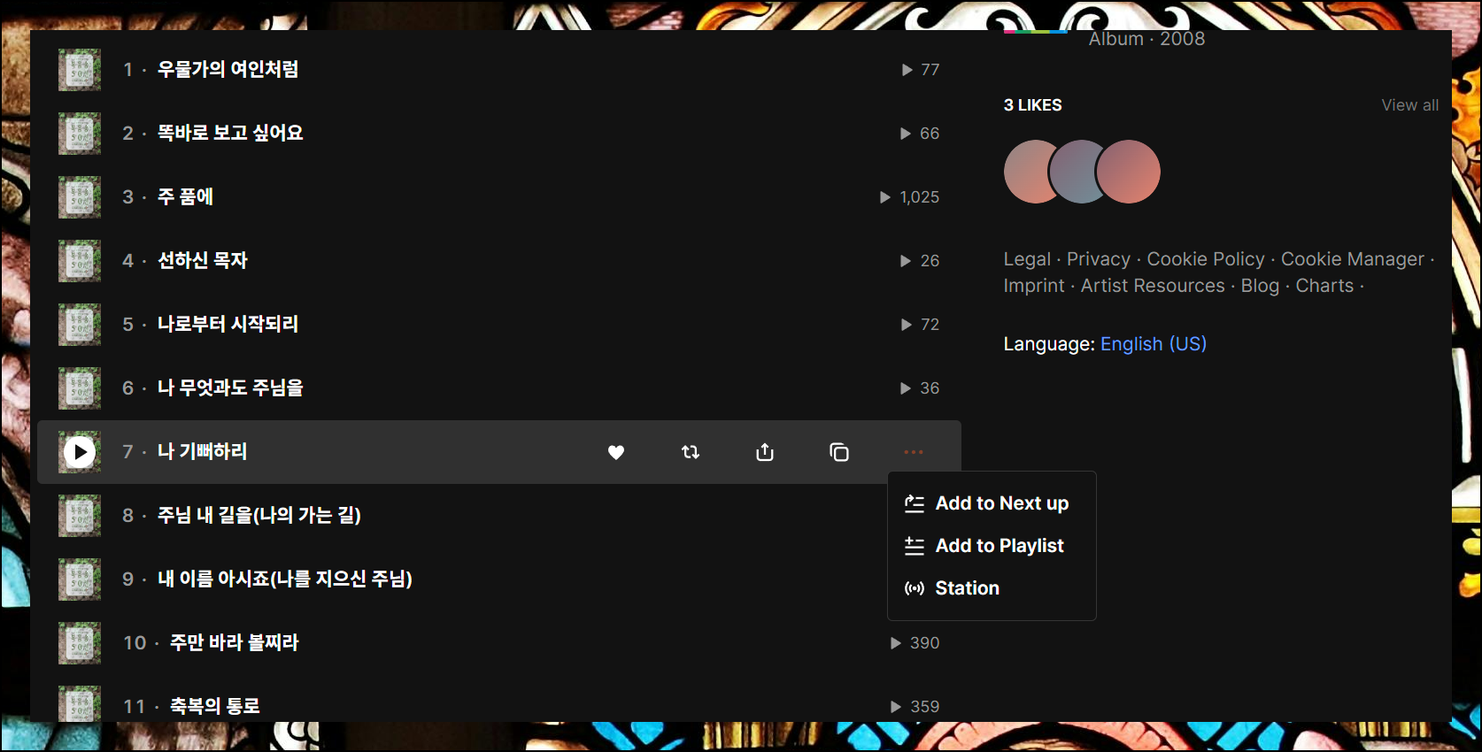 재생목록 페이지를 살펴보면 제목 옆에 메뉴 버튼이 있습니다. 해당 버튼을 누르면 여러 가지 메뉴가 나타나는데요. 나만의 컬렉션을 구성하고 싶다면 "Add to Playlist" 메뉴를 선택하면 됩니다.
