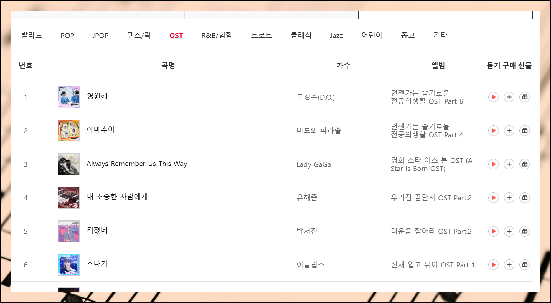 리스트 우측의 재생 아이콘을 눌러보세요. 음원을 구매하기 이전에 미리 들어볼 수 있습니다.