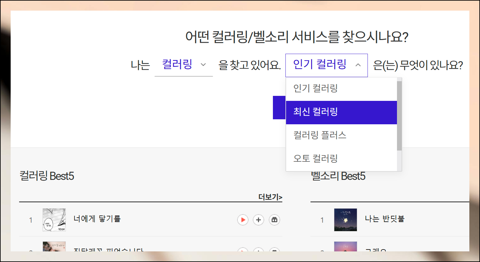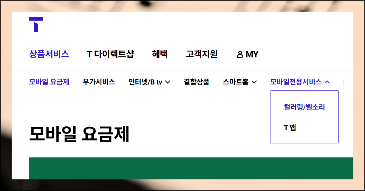 컬러링 서비스는 "모바일 전용 서비스" 메뉴를 선택하면 찾을 수 있어요. 벨소리 설정도 이곳에서 처리 가능합니다. 벨소리 바꾸는법 또한 간단하게 진행할 수 있어요.