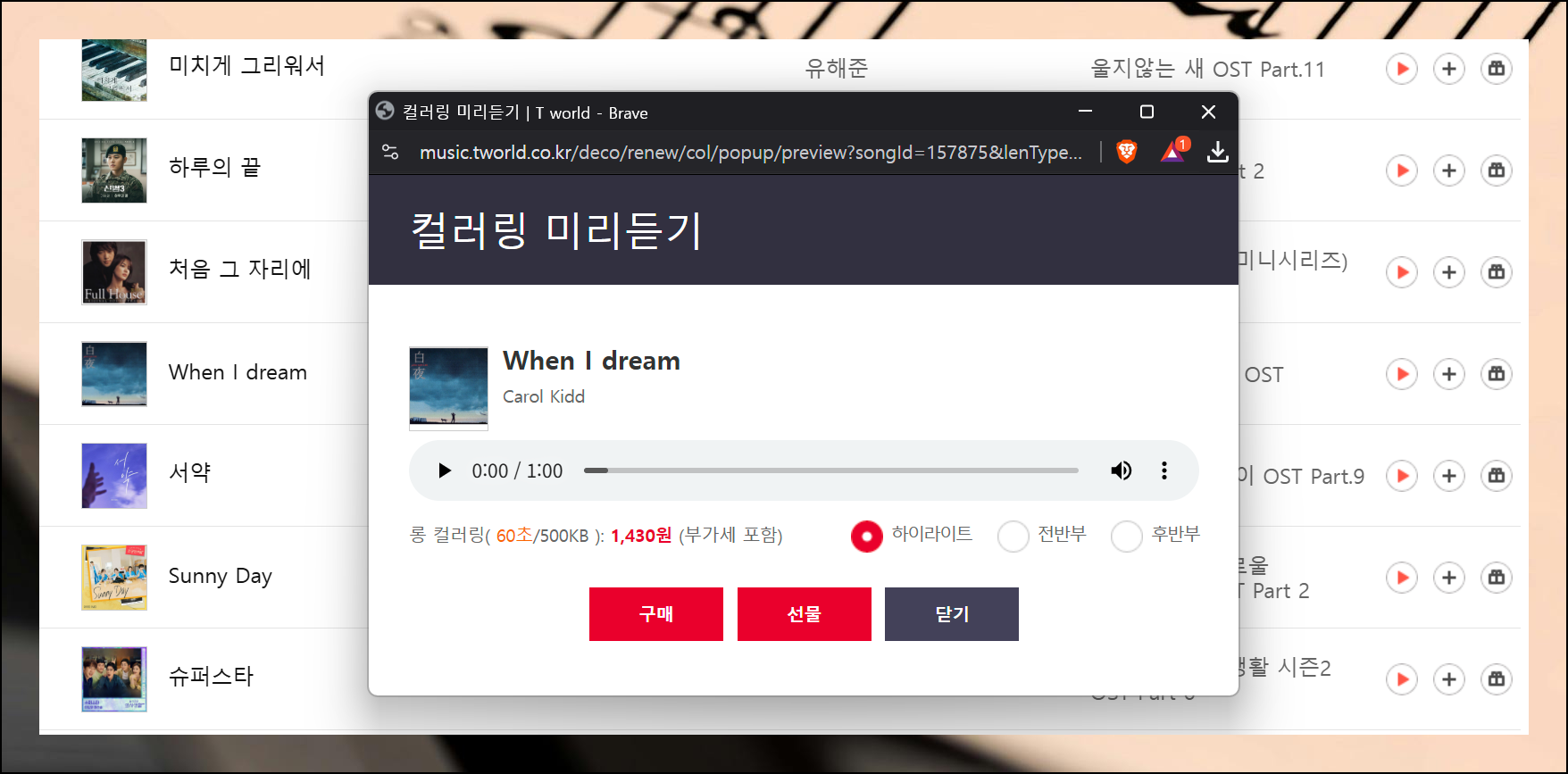 마음에 드는 음원을 찾았다면 "구매" 버튼을 누르면 모든 과정이 완료되어요. "선물" 버튼은 다른 사람의 휴대폰에 음원을 보내주고 싶을 때 사용하는 기능이에요.