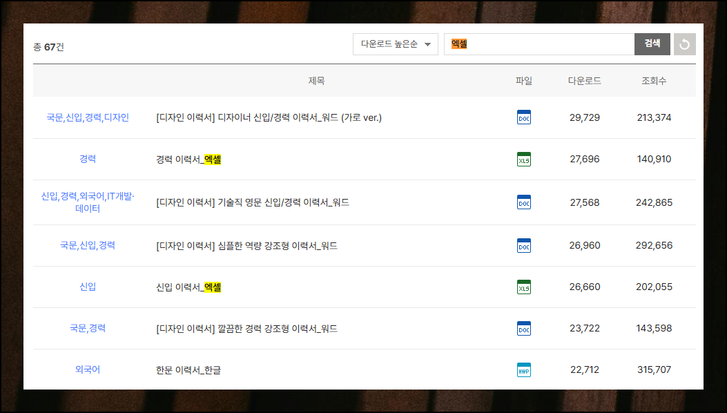 여기에서 "다운로드 높은순"을 선택해 보세요. 그 다음 "엑셀"로 검색을 하면 됩니다. 그럼 다양한 버전으로 된 엑셀 서식을 만나볼 수 있어요.