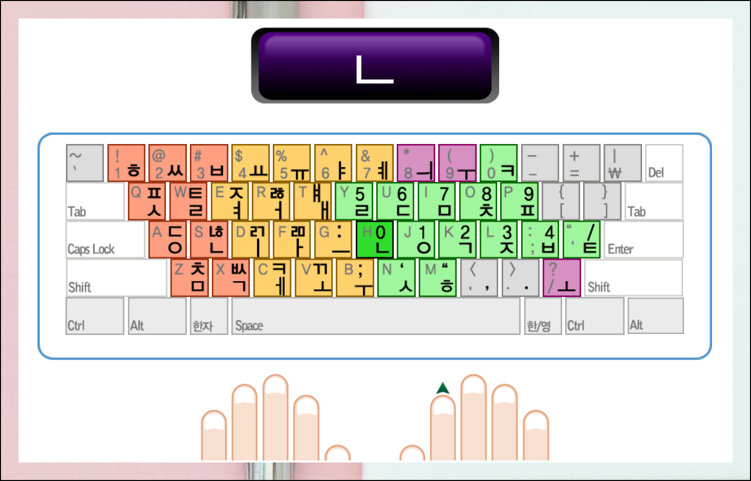 화면에 나타나는 손가락 가이드라인을 반드시 확인하세요. 지속적인 훈련을 통해 한글과 영문 키보드 배치를 제대로 익힐 수 있습니다.
