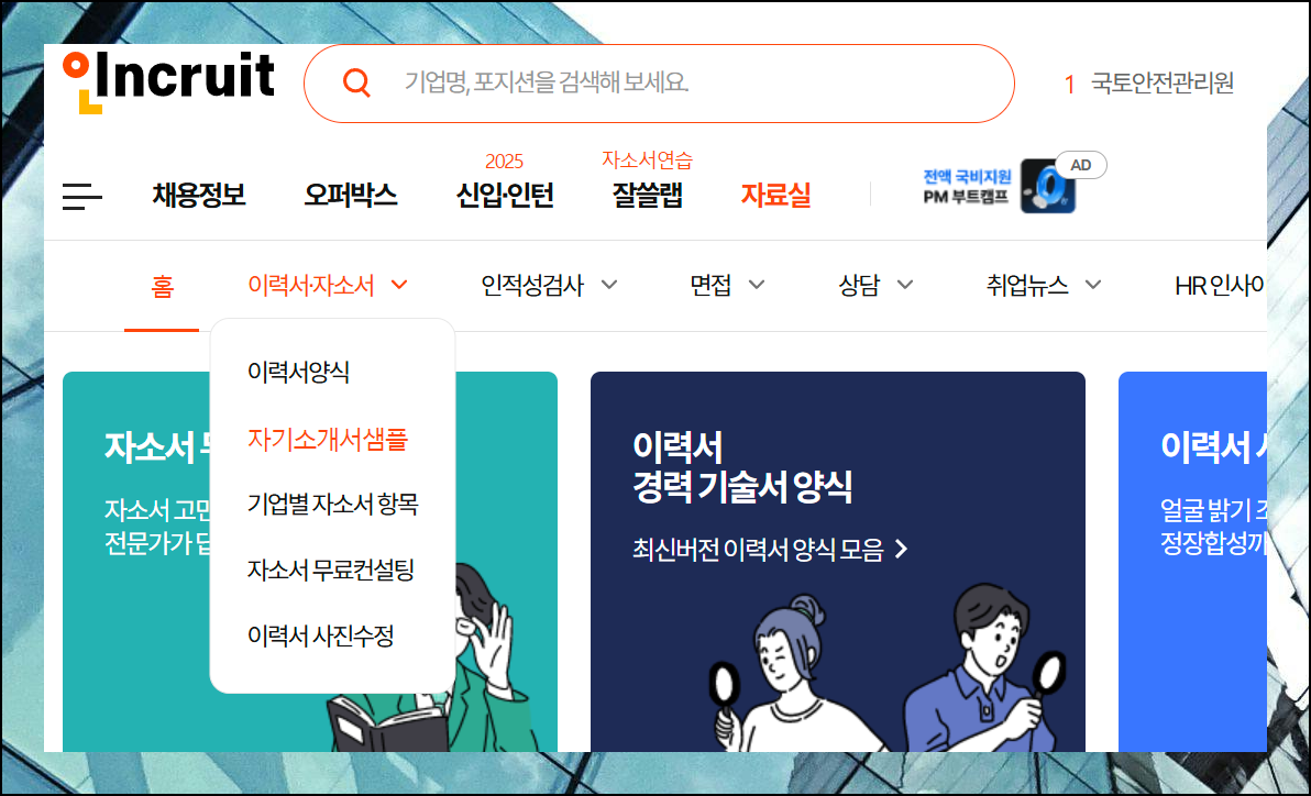 취업 포털 사이트 인크루트에서 이런 귀중한 자료들을 모아 사이트 회원들에게 무료로 제공하고 있어요.