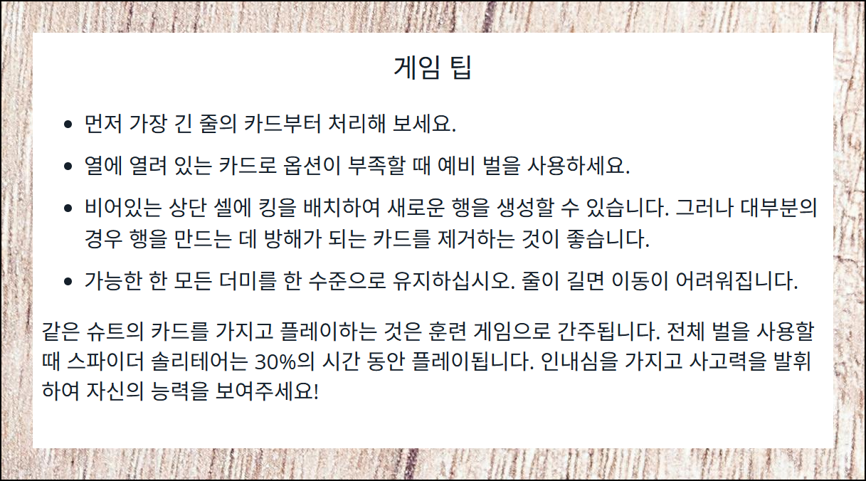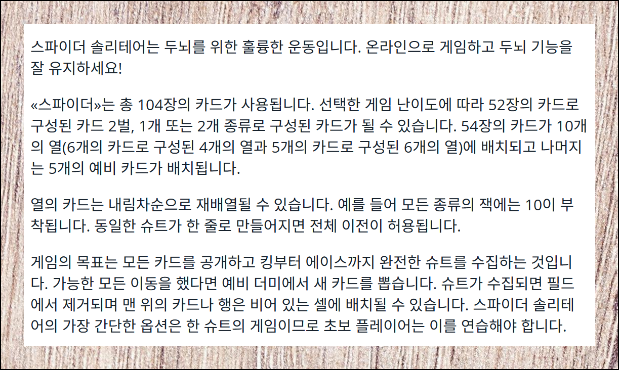 스파이더 솔리테어를 처음 접하는 분들에게 핵심 규칙을 쉽게 설명 드리겠습니다. 오랜만에 카드놀이를 하는 분들도 금세 감을 잡으실 수 있을 거예요.