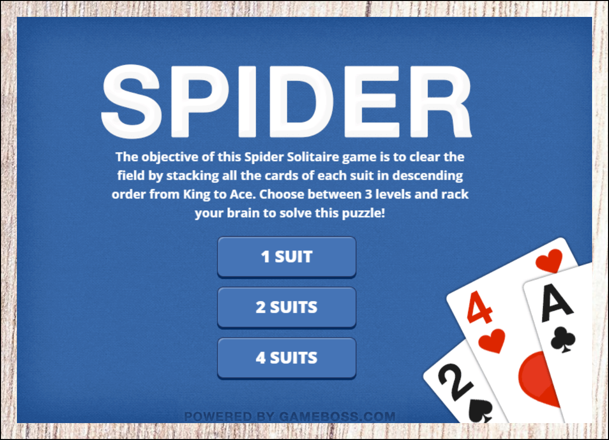 스파이더 게임을 클릭하면 세 가지 레벨 중에서 고를 수 있어요. 게임이 처음이라면 1 SUIT 모드로 시작하는 걸 강력히 추천해요. 실력이 늘어나면 점점 더 어려운 단계에 도전해보시면 됩니다.
