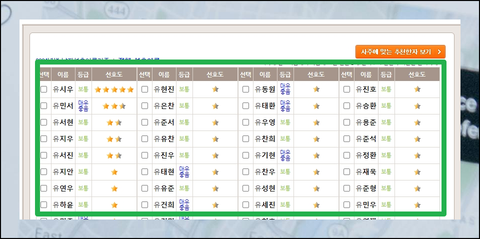 이제 결과 화면이 나타났어요. 무료 서비스 범위 내에서 총 300개의 한글 좋은 이름모음을 확인할 수 있습니다. 이 중에서 마음에 드는 명칭 3개를 선택하면 한자 조합까지 무료로 추천받을 수 있어요. 각 이름의 등급과 선호도 점수를 참고해서 본인이 좋다고 생각하는 것들을 골라보세요. 선택이 끝나면 표 상단 오른쪽에 있는 [사주에 맞는 추천한자 보기 버튼]을 눌러주면 됩니다.
