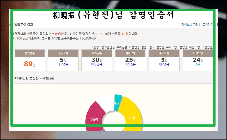 한자 목록에서 가장 마음에 드는 좋은 이름모음을 찾았다면 풀이 버튼을 클릭해보세요. 그러면 전문적인 감명인증서를 받아볼 수 있어요. 이 인증서에는 해당 호칭의 인기 순위와 성명학 종합점수 산출 과정이 자세히 나와 있습니다. 완성된 인증서는 SNS를 통해 저장하거나 공유할 수 있어서 가족들이나 친구들과 함께 의견을 나누며 최종 결정을 내릴 수 있어요.