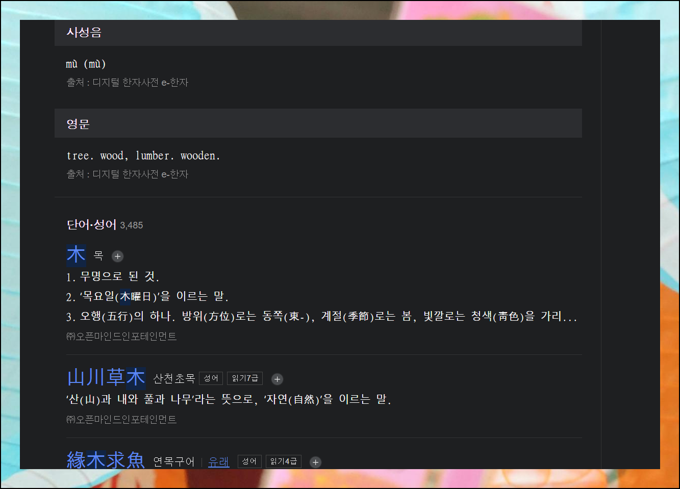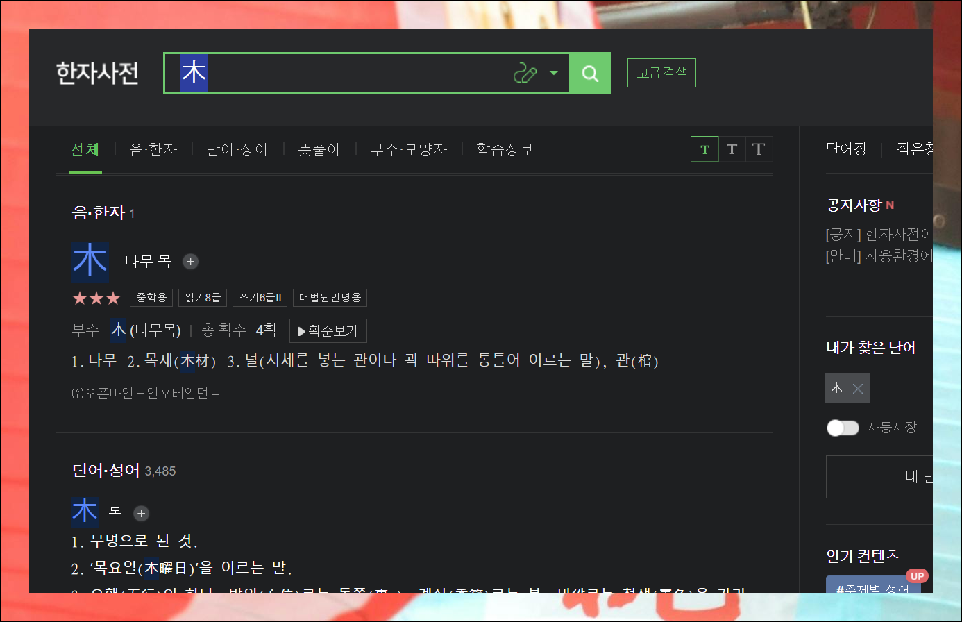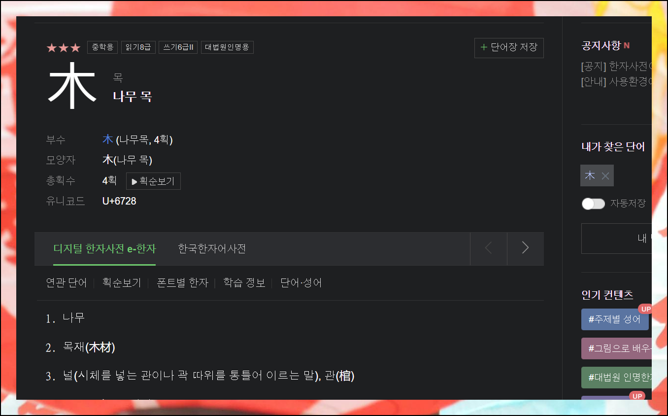 첫 화면에는 부수와 획수, 정확한 쓰는 순서가 나와 있어요. 옥편에서 보던 기본적인 정보들이 체계적으로 정리되어 있습니다. 그 아래쪽에는 다양한 의미들이 차례로 나열되어 있는데요. 한문에는 우리가 평소에 알고 있던 뜻보다 훨씬 많은 의미가 있다는 걸 알게 됩니다.