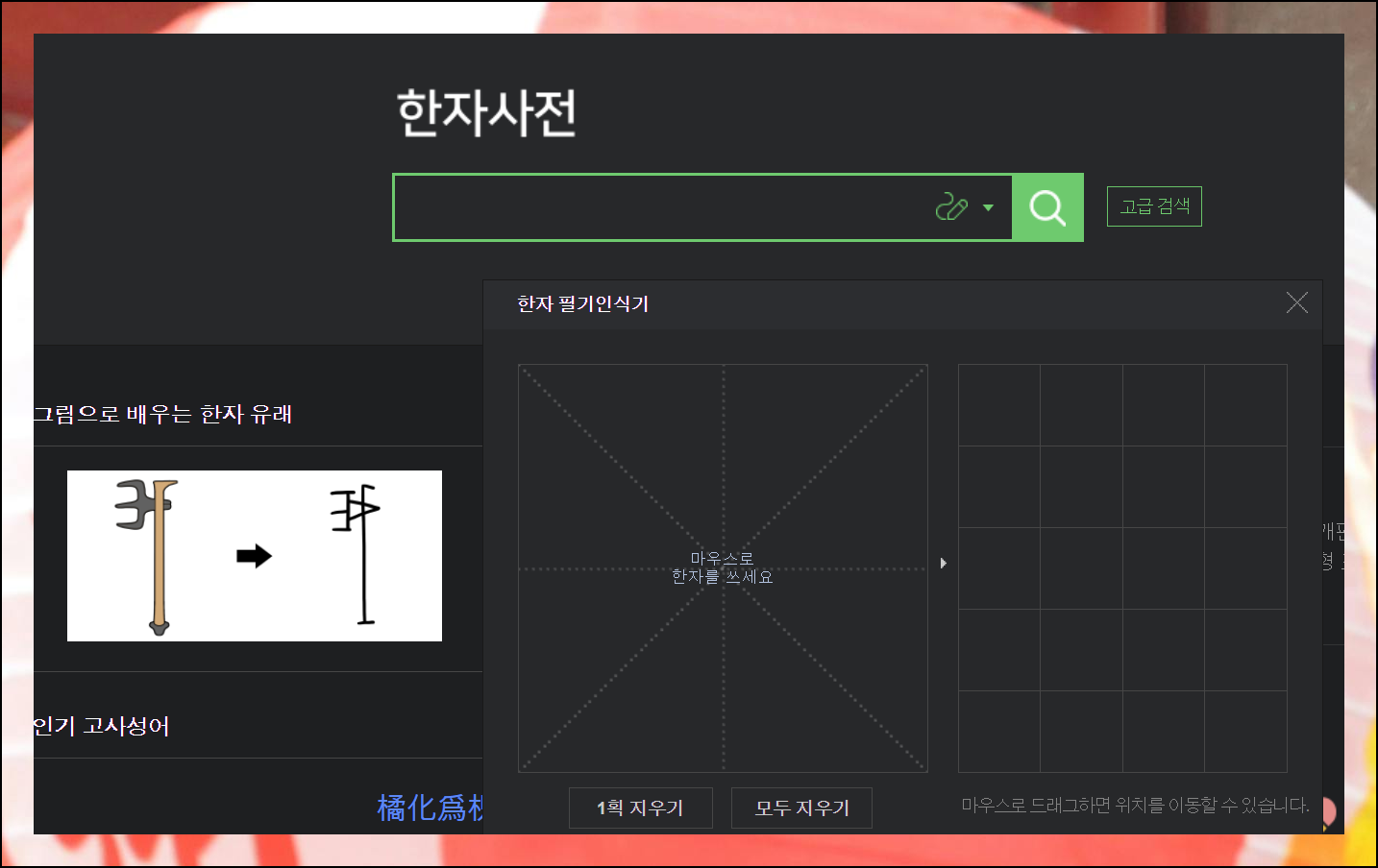 온라인 옥편 사이트에 접속했습니다. 오른편에 있는 필기 인식 도구를 활용해보세요. 마우스나 손가락으로 한자를 그려보면 바로 인식돼요. 컴퓨터를 쓸 때는 마우스를 끌어서 그리고, 모바일에서는 화면을 터치해서 직접 써보면 됩니다. 옥편처럼 한문의 부수를 일일이 찾아 헤매지 않아도 되니까 정말 편리하죠.