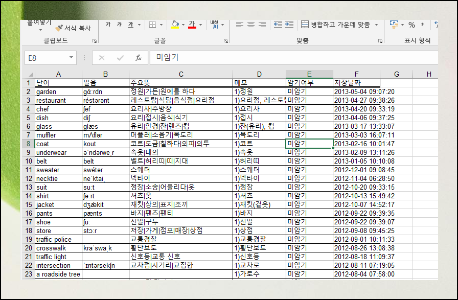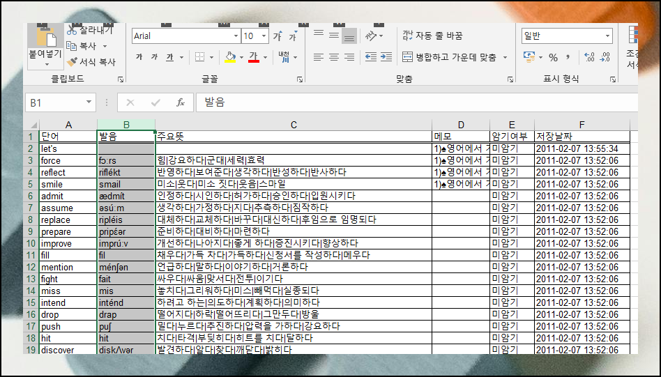 다운로드를 완료하면 파일이 엑셀 형태로 저장돼요. 파일을 열어보면 어휘, 발음, 주요 뜻, 메모란, 암기 체크 등으로 구성되어 있어요. 엑셀 양식이라서 편집이 정말 쉬워요. 색깔을 바꾸거나 필요한 항목을 추가해서 나만의 특별한 학습 양식으로 만들어 사용하면 완벽해요.