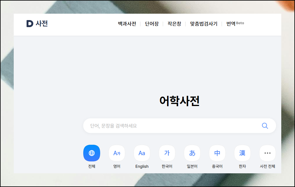 다음 사전 페이지가 열리면 상단 메뉴를 확인해보세요. 백과사전, 작은창, 맞춤법 검사기 등이 보일 텐데요. 이 중에서 두 번째에 자리한 단어장 버튼을 찾아서 눌러주세요.