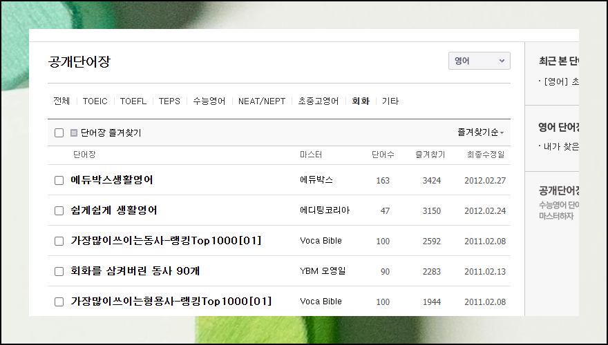 공개단어장 섹션에 들어가면 정말 다양한 학습 자료를 만날 수 있어요. 토익, 토플, 텝스 같은 공인시험용은 물론이고 수능영어, 초중고영어, 회화용까지 세분화되어 있어요. 각 카테고리마다 상당히 많은 어휘집이 준비되어 있어서 자신의 목표에 딱 맞는 것을 선택할 수 있어요.