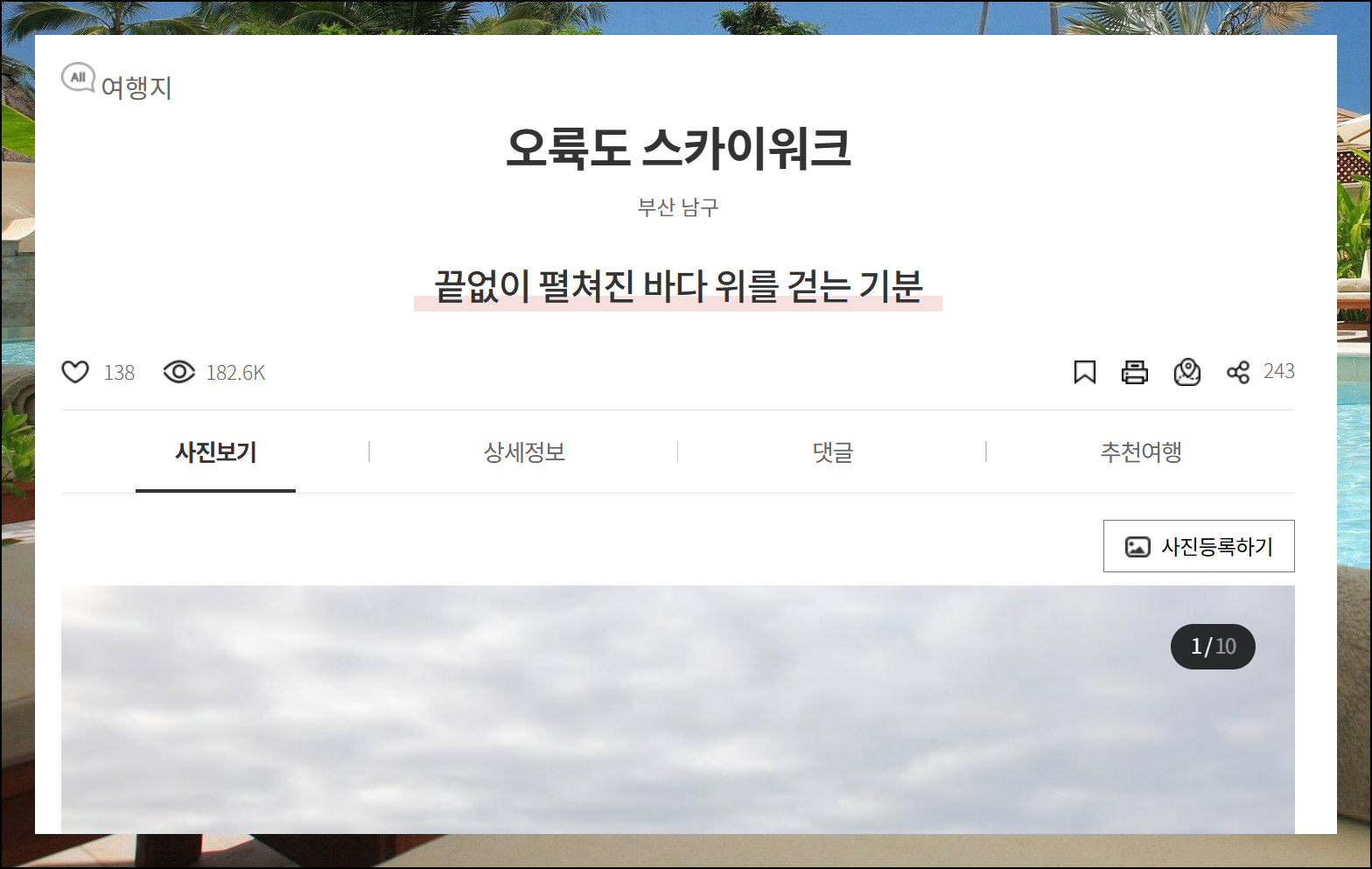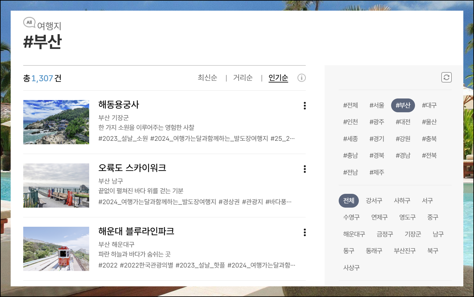 부산을 선택해 보았어요. 이곳에서 추천하는 곳이 무려 1,307개나 됩니다. 전국 방방곡곡을 다녀본다면 평생을 해도 다 못할 정도로 엄청나게 많은 여행지가 있다는 것을 새삼 깨달을 수 있었어요.