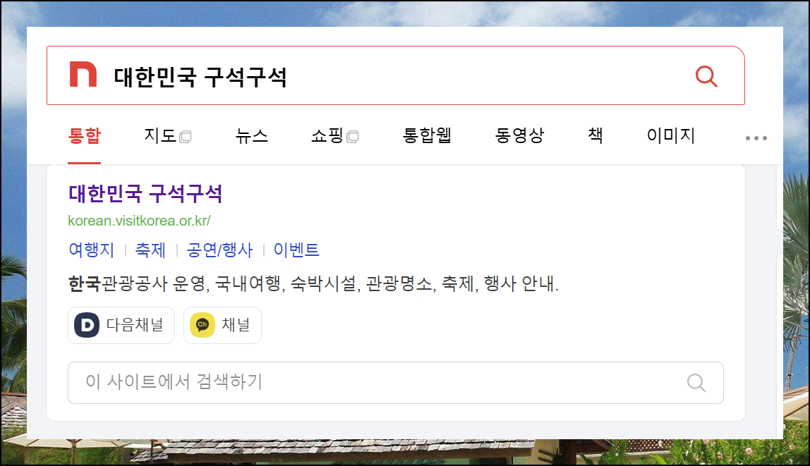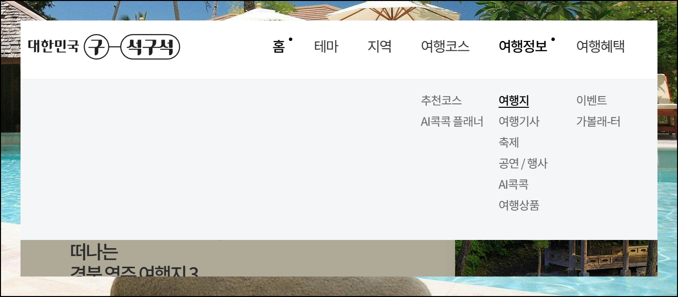 공식 홈페이지에서 메뉴 선택을 하는 것보다 구글에서 검색하는 것이 더욱 간편합니다. "대한민국 구석구석 한국관광 100선"이라고 검색해 보세요. 그럼 바로 우리가 찾는 서비스로 이동이 가능합니다.