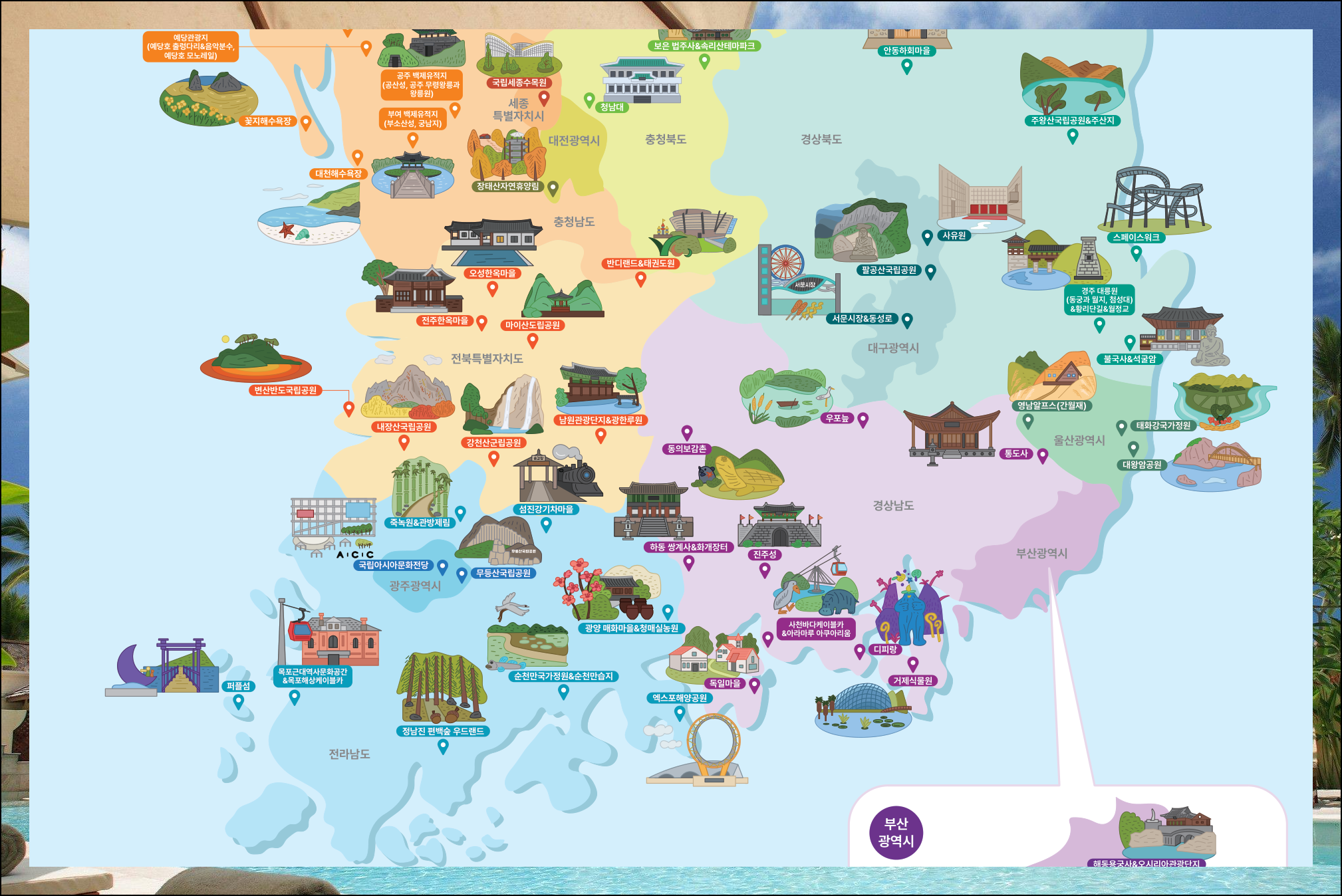 다운 받은 자료를 자세히 살펴보겠습니다. 여행지 그림이 예쁘게 그려진 전국 지도를 통해 어느 지역에 어떠한 유명 여행지가 위치하는지 한눈에 파악할 수 있어요.